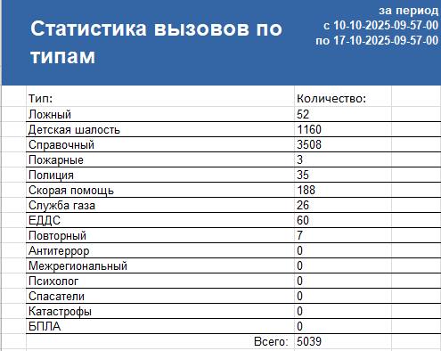 В период с 10 октября по 17 октября 2025 года Центром обработки вызовов ГКУ "Служба 112" было принято и обработано 5039 вызова для оказания помощи населению.