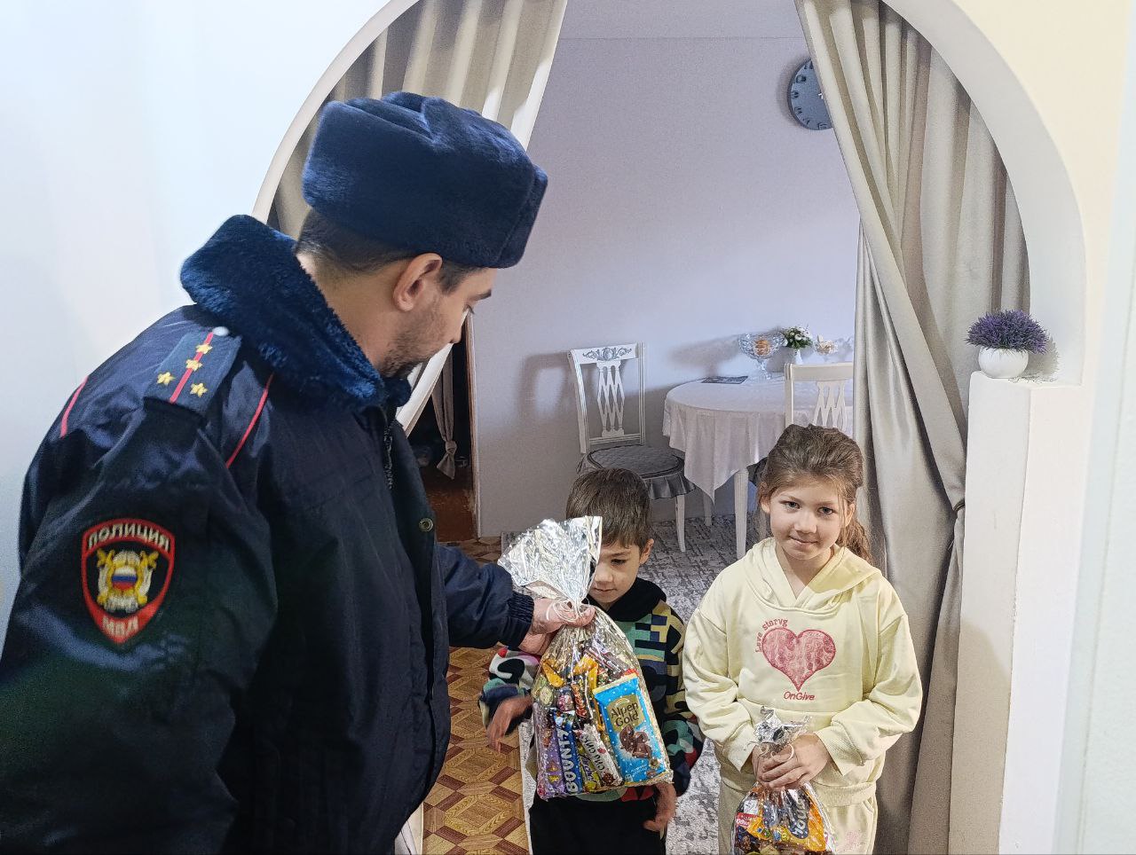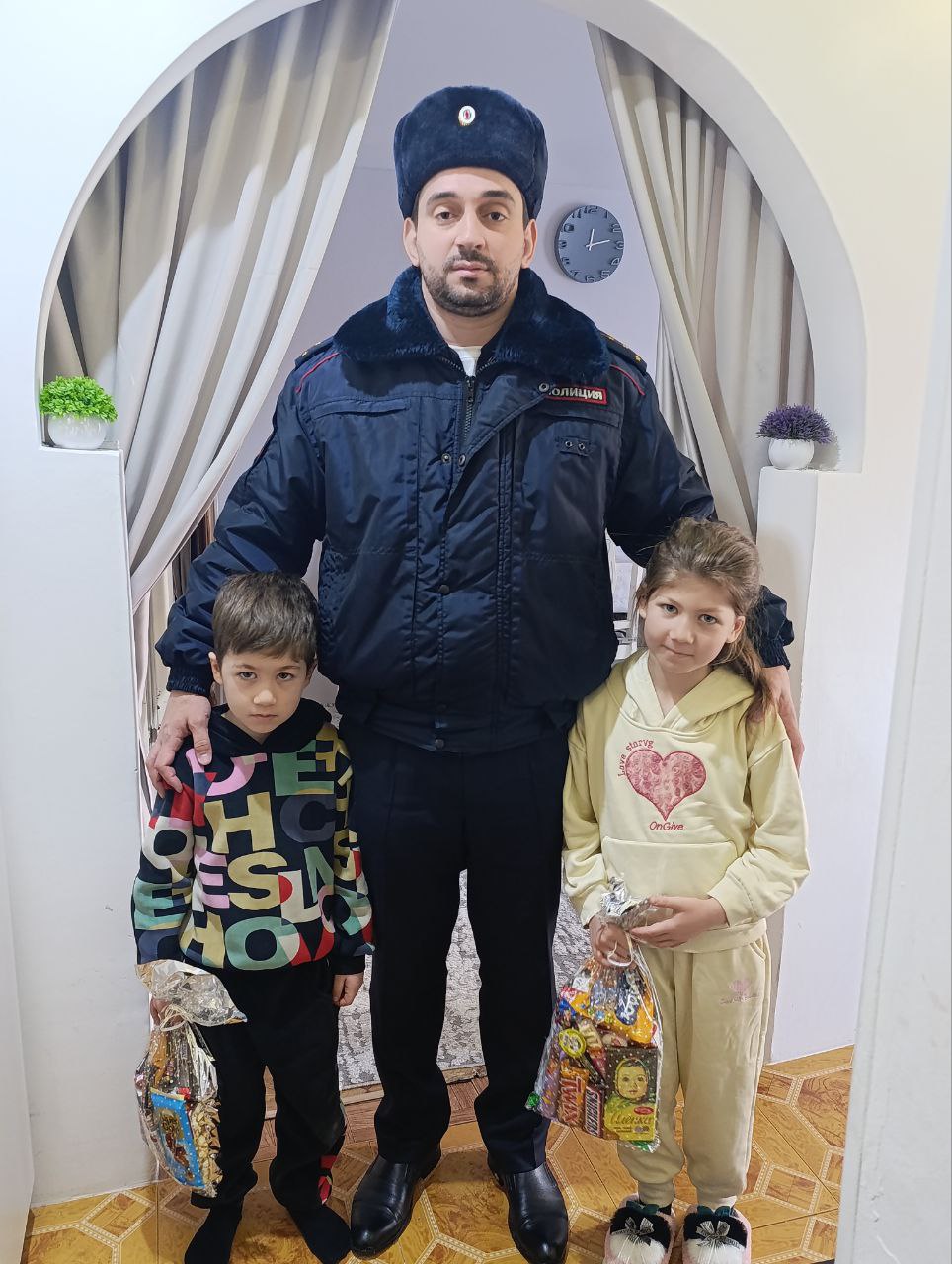 В преддверии Нового года стражи правопорядка крупнейшего города республики порадовали почти сто малышей сладкими подарками. Подобные встречи уже давно стали хорошей традицией, и каждый раз дети с нетерпением ждут новой встречи с полицейскими.