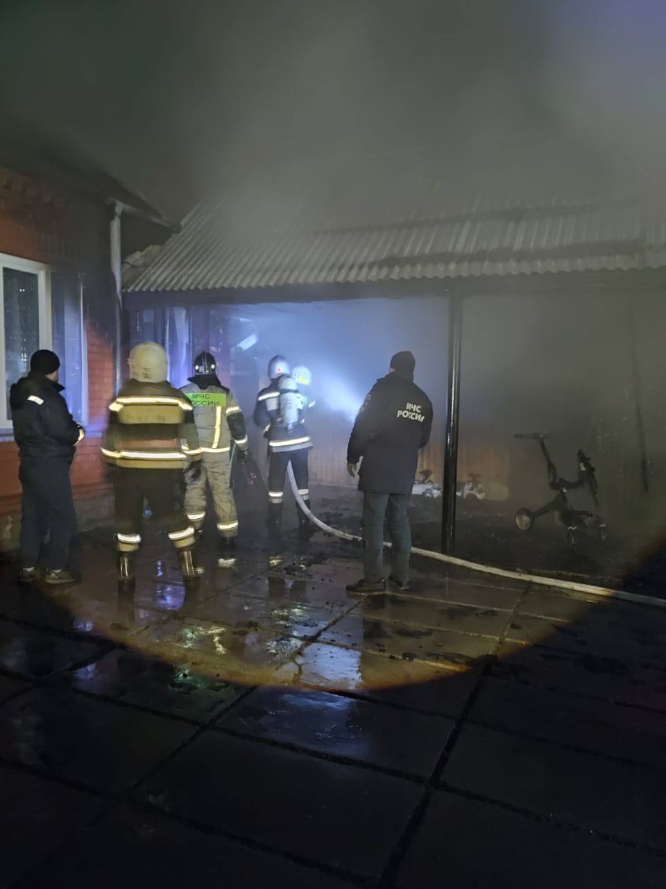 На место происшествия выезжали спасатели поисково-спасательного отряда "Эрши" и пожарные из пожарно-спасательной части № 3 г. Сунжа. По прибытии на место происшествия было установлено, что произошло возгорание подсобного помещения с навесом. Общая площадь пожара составила 60 м2.