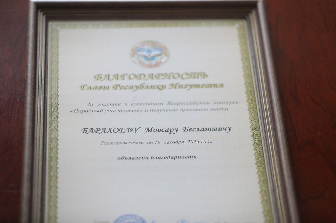 Председатель Правительства Республики Ингушетия Владимир Сластенин вручил Благодарность Главы Республики участковому уполномоченному полиции Мовсару Барахоеву. Страж правопорядка отмечен Махмудом-Али Калиматовым за высокий результат во Всероссийском конкурсе «Народный участковый-2025». Майор полиции из Ингушетии вошел в тройку лучших участковых страны, набрав более 392 тысяч голосов и заняв второе место во всероссийском состязании.