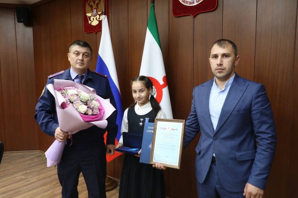 Офицер следственного управления Следственного комитета Российской Федерации по Республике Ингушетия в рамках Всероссийской общественно-государственной инициативы «Горячее сердце» наградил нагрудным знаком «Горячее сердце» юную героиню Хадижу...