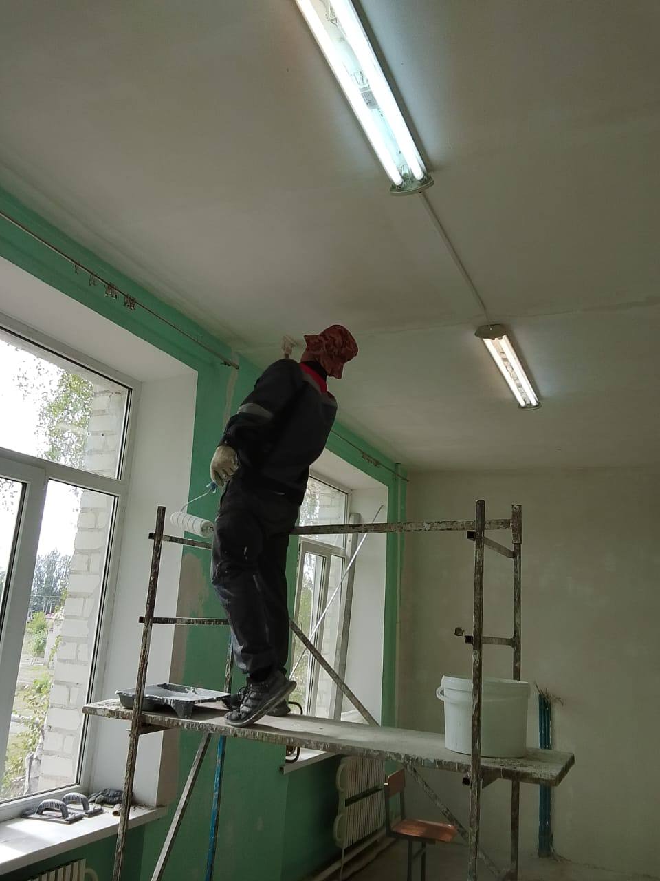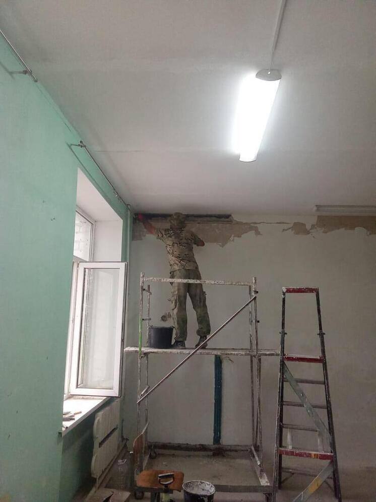Бригада по аварийному восстановлению, из Ингушетии, приступила к предварительной отделке учебного кабинета в средней школе №2 города Молочанска.
