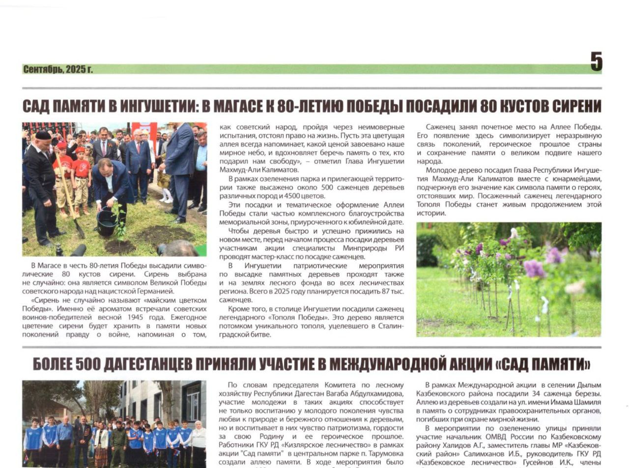 В сентябрьском номере читайте о том, как Ингушетия присоединилась к международной акции «Сад Памяти», приуроченной к 80-летию Победы в Великой Отечественной войне.