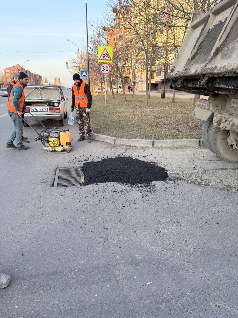 На улицах Х. Муталиева, К.Кулиева и С.Чахкиева специалисты ЖКХ проводят ямочный ремонт