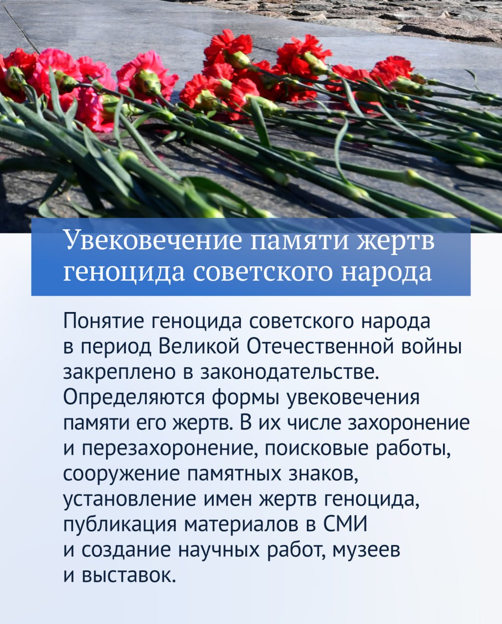 По словам Председателя Государственной Думы, в течение прошедшего года было принято восемь законов о сохранении и защите исторической памяти. Среди них — установление новых памятных дат России, ответственность за осквернение воинских захоронений и других мемориалов как в стране, так и за рубежом, увековечение памяти жертв геноцида советского народа, погибших от рук нацистов. «Важно противодействовать любым попыткам переписать историю и обесценить роль советского народа в разгроме фашизма, и работу эту надо проводить постоянно», — говорил Вячеслав Володин.