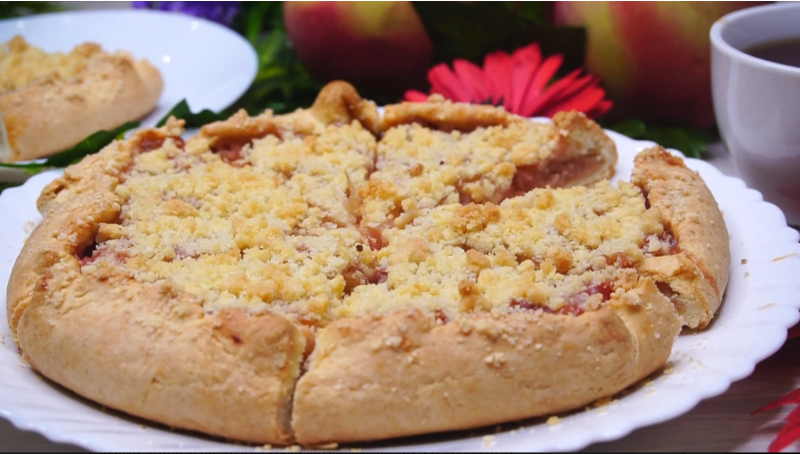 По истечении времени охлаждения тесто раскатывается в круг толщиной около 5 мм и диаметром 30-35 см. Его помещают на противень, застеленный бумагой для выпечки. Затем посыпают крахмалом, укладывая яблочную начинку, оставляя края свободными для загиба. Оставшиеся края теста аккуратно загибаются, после чего пирог покрывается крошкой, приготовленной из оставшихся ингредиентов.