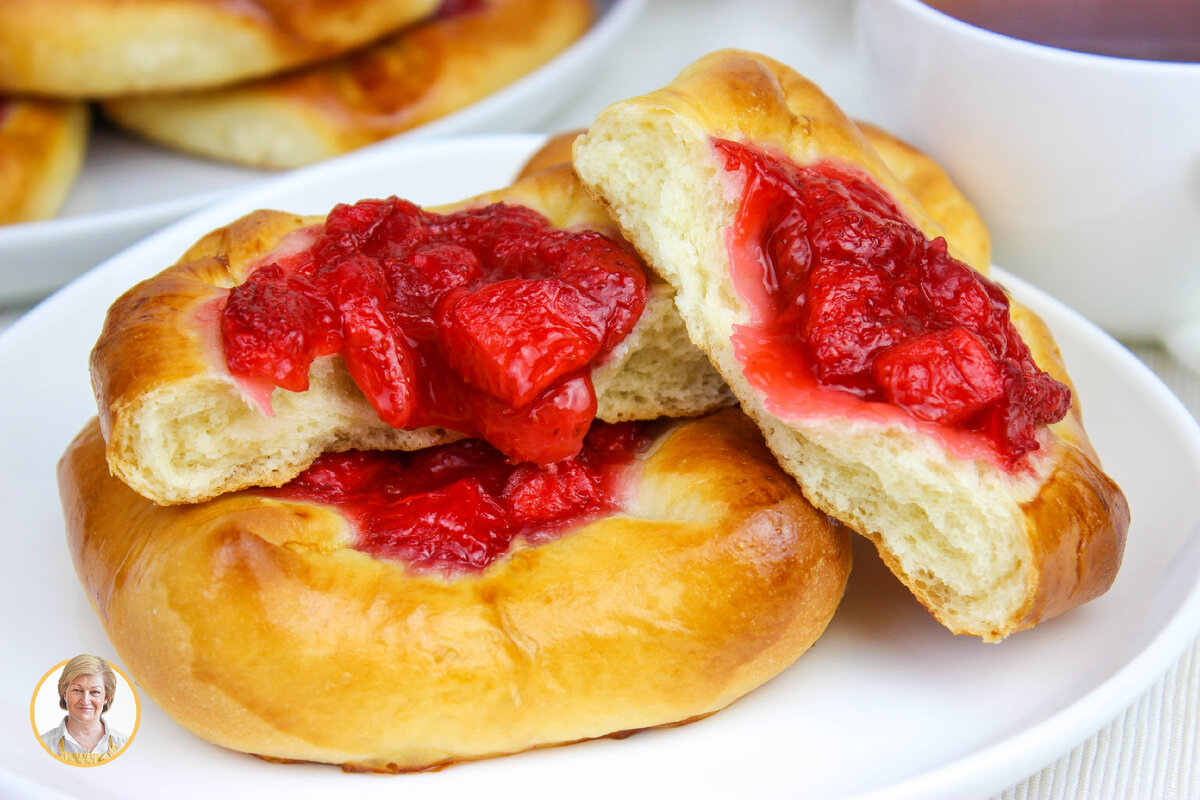 В центре каждой булочки следует сделать углубление, а затем аккуратно смазать взбитым желтком с молоком. В каждую булочку добавляется клубничная начинка, после чего они отправляются в заранее разогретую духовку на 20-25 минут при 180°С до золотистой корочки.