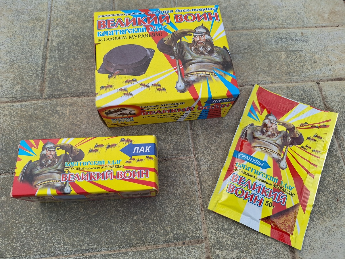 Гранулы от муравьев «Великий воин» — одно из самых популярных средств для борьбы с муравьями. Они удобно применяются, имеют яркий цвет и заметны на земле. В процессе тестирования гранулы были использованы на садовых дорожках, где были замечены муравьиные тропы и кучки песка.