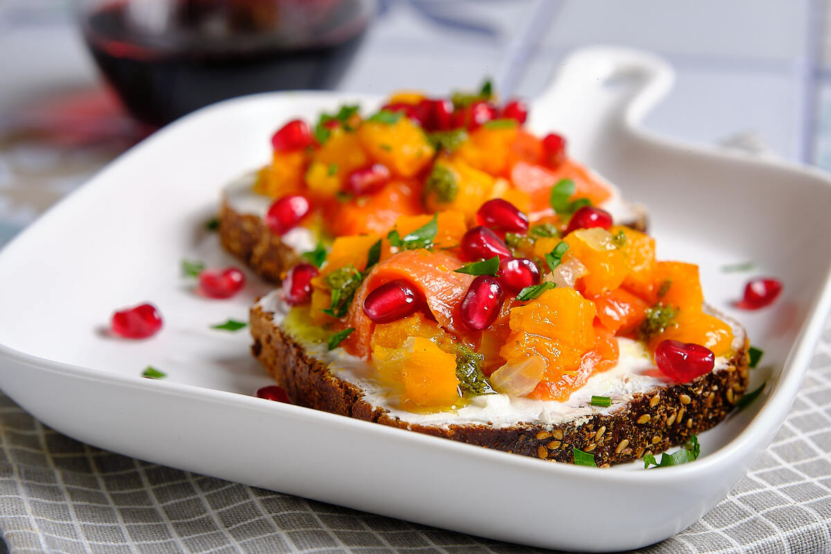 В основу этого кулинарного шедевра вошли несколько ключевых ингредиентов: хлеб ржаной, красная малосольная рыба, творожный сыр, печеная тыква, лук, специи, растительное масло, гранат, зеленый соус и зелень. Вместо традиционной нерки можно использовать и другие виды красной рыбы, что делает это блюдо универсальным и доступным для многих.