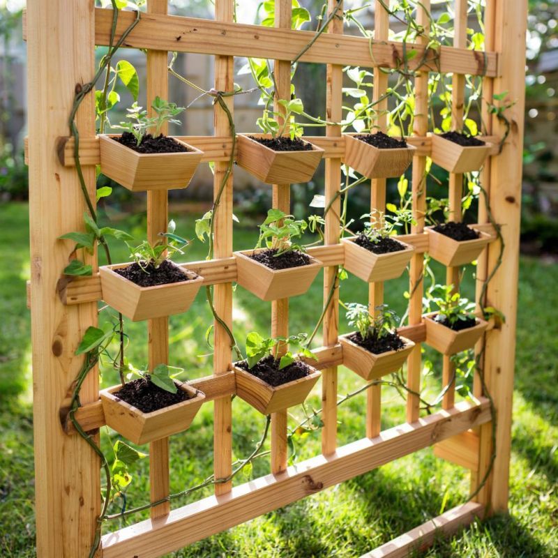 Решетка сама по себе может служить опорой для вьющихся растений, однако добавление карманов для грунта явно повышает ее полезность, трансформируя экран в автономную вертикальную грядку. Карманы, изготовленные из прочного, но дышащего геотекстиля, устанавливаются на решетке в шахматном порядке. Это позволяет разрабатывать привлекательный визуальный рисунок будущего вертикального сада. Объем карманов можно варьировать, позволяя высаживать как маленькие однолетники, так и более крупные многолетники.