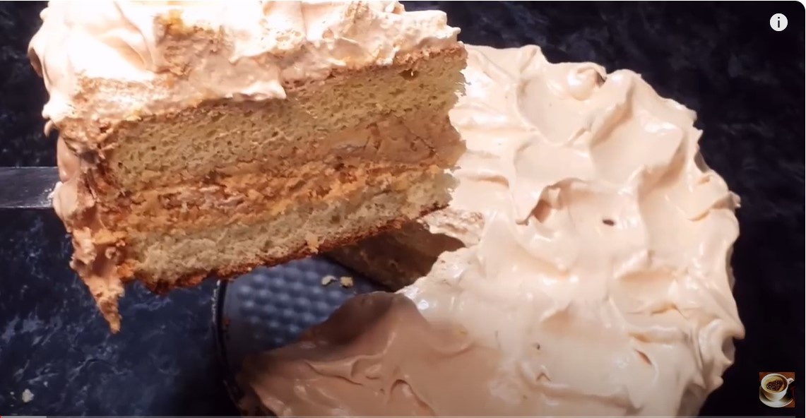 После того как бисквит охладится, разрежьте его на два коржа. На первый корж нанесите крем, накройте вторым и украсьте сверху карамельным безе. Этот десерт просто создан для того, чтобы стать звёздным угощением на вашем столе во время чаепития.
