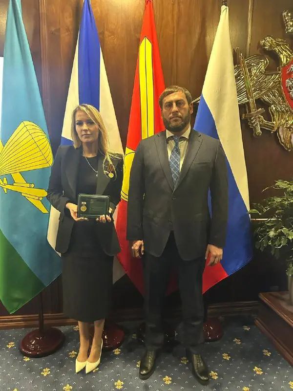 Первый заместитель премьер-министра региона Магомед Евлоев вручил юбилейную медаль «100 лет государственности Республики Ингушетия» депутату Государственной Думы России Яне Лантратовой.