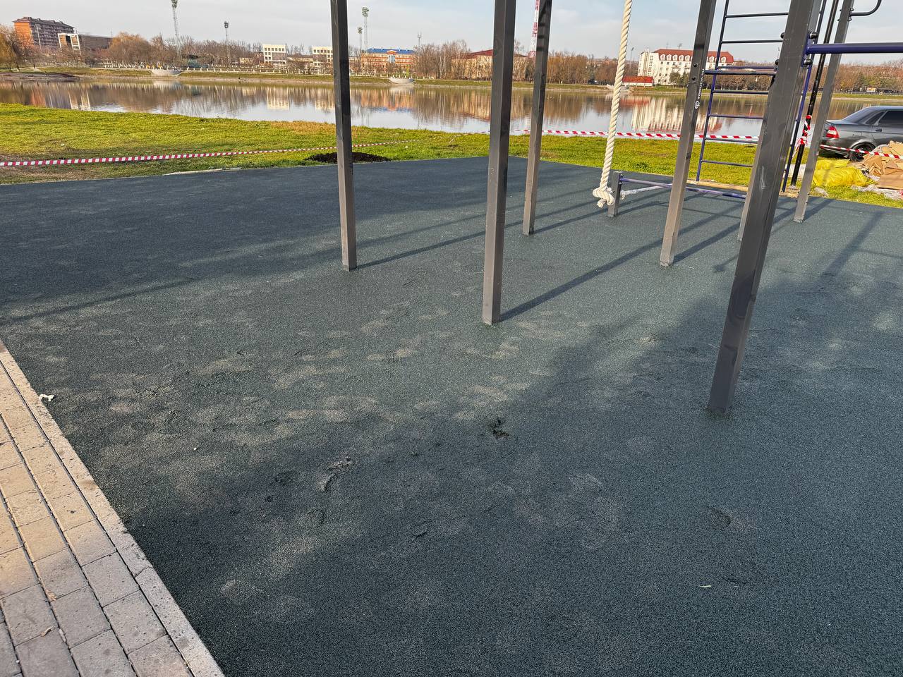 Вечером уложили свежее покрытие, аккуратно огородили его красной предупредительной лентой, чтобы никто не заходил, пока основание не застынет. Хотели, чтобы к открытию все было идеально — для горожан, для детей, для тех, кто ждет эти площадки и радуется каждому новому объекту.