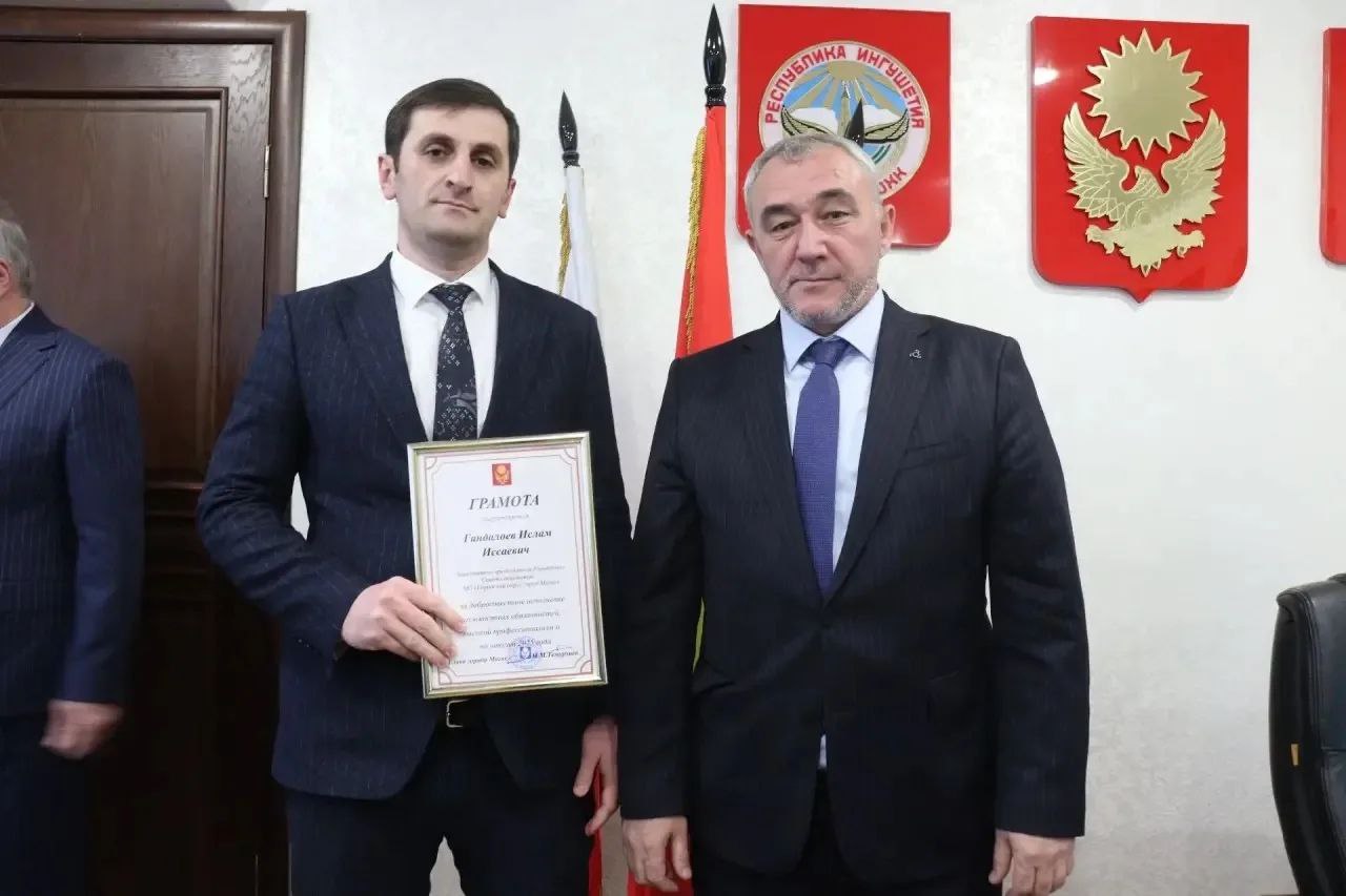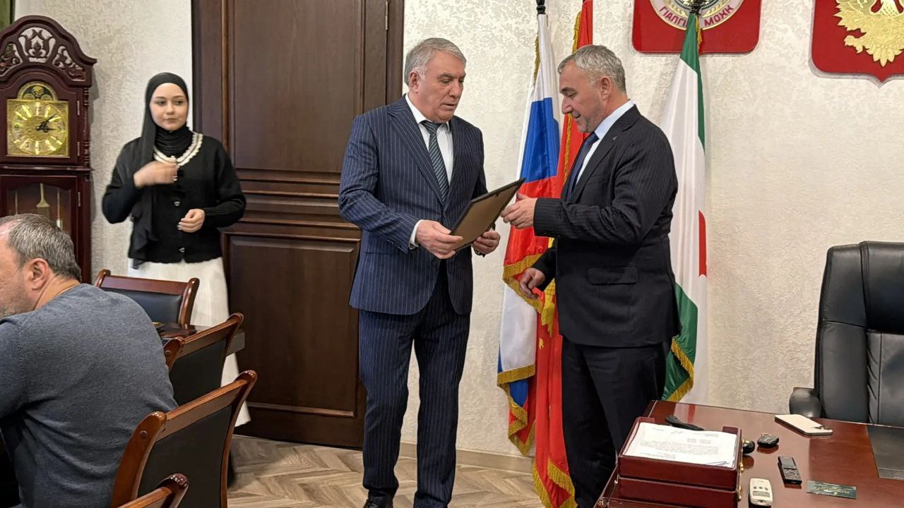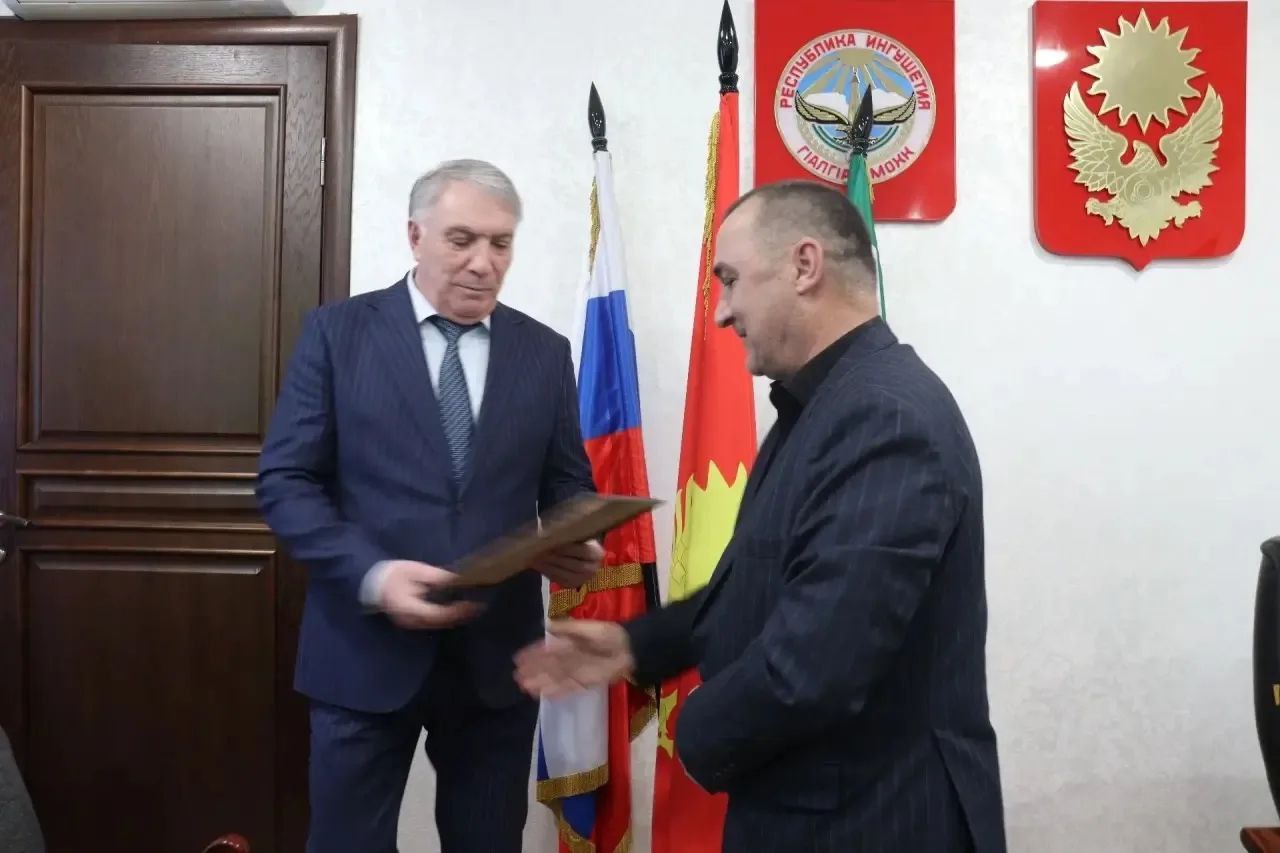 Хаваж-Багаудин Дарсигов, председатель городского совета Магаса, и Ислам Гандалоев получили награды от Мусы Темурзиева за успешную деятельность и эффективное сотрудничество.