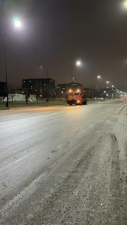 Из-за неблагоприятных погодных условий, в частности гололеда, техника коммунальных служб всю ночь работала на улицах города, посыпая дороги пескосоляной смесью.