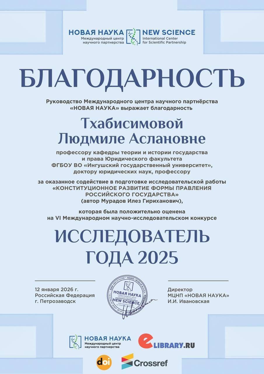 Диплом I степени в номинации «Конституционное право и государственное строительство» получил магистрант юридического факультета ИнгГУ на VI Международной научно-практической конференции.