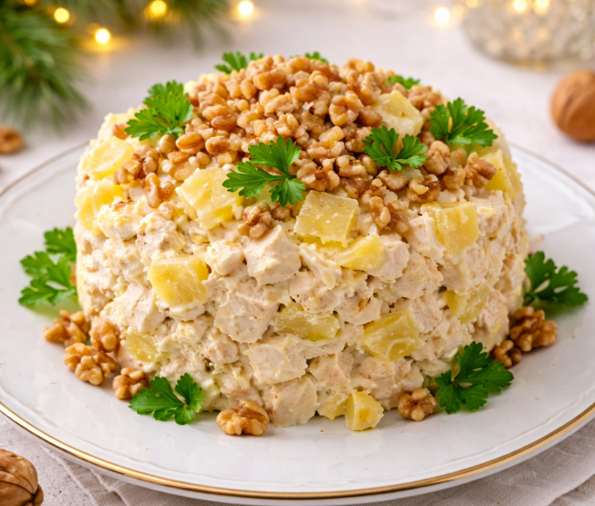 При подаче предложите украсить салат орехами и зеленью или используйте кулинарное кольцо, чтобы оформить порции, добавив сверху тертый сыр и кусочки ананаса. Салат «Сицилия» — это простое решение для тех, кто хочет сделать праздник ещё более ярким и запоминающимся!