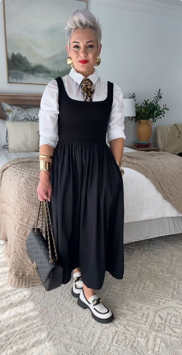 - Классика белого и черного никогда не выходит из моды, но для получения уникального стиля стоит добавить оригинальные детали. Основой может служить белая рубашка и длинное черное платье. Подходящая обувь — белые лоферы, а в качестве акцентов подойдут галстук с леопардовым принтом, черная сумка с цепочкой и золотые украшения.