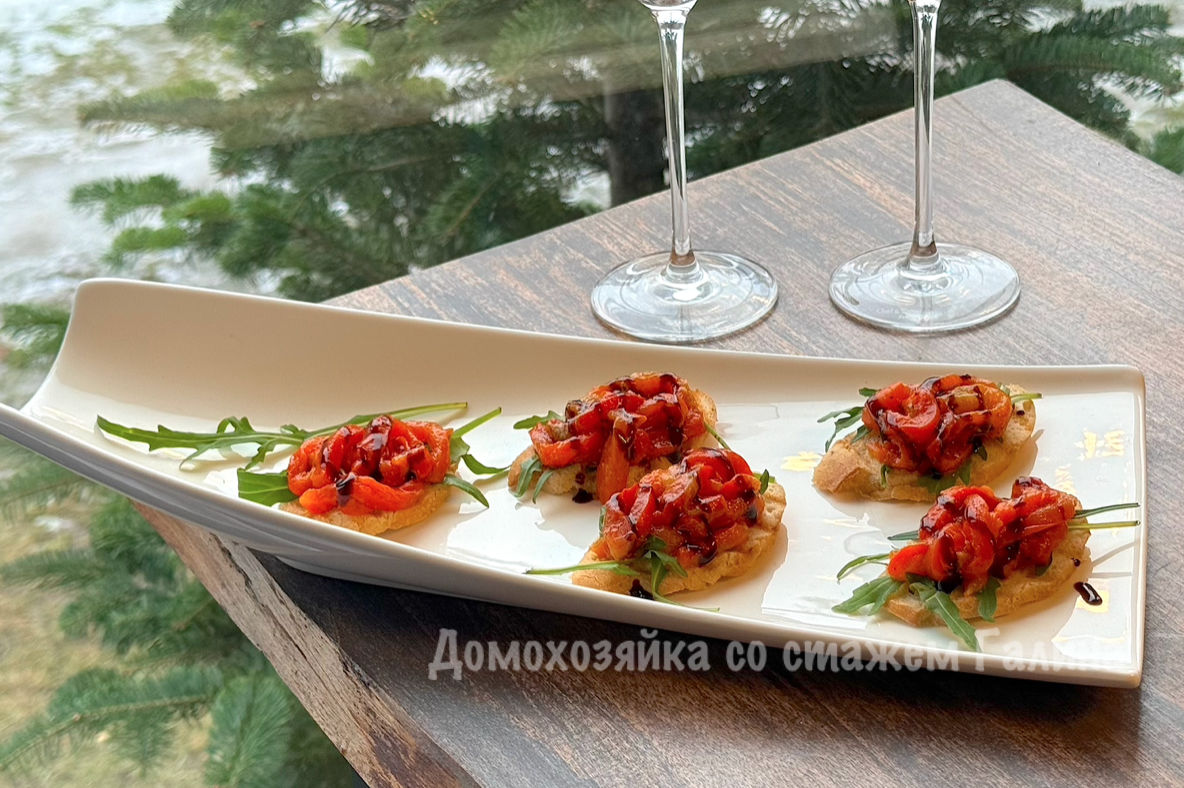 Багет нарежьте на тонкие ломтики и слегка подсушите на гриле. На каждую гренку уложите руколу или любой другой свежий лист салата, затем щедро добавьте ароматные запечённые перцы. Завершите все немного бальзамическим соусом — и ваше зимнее угощение готово!