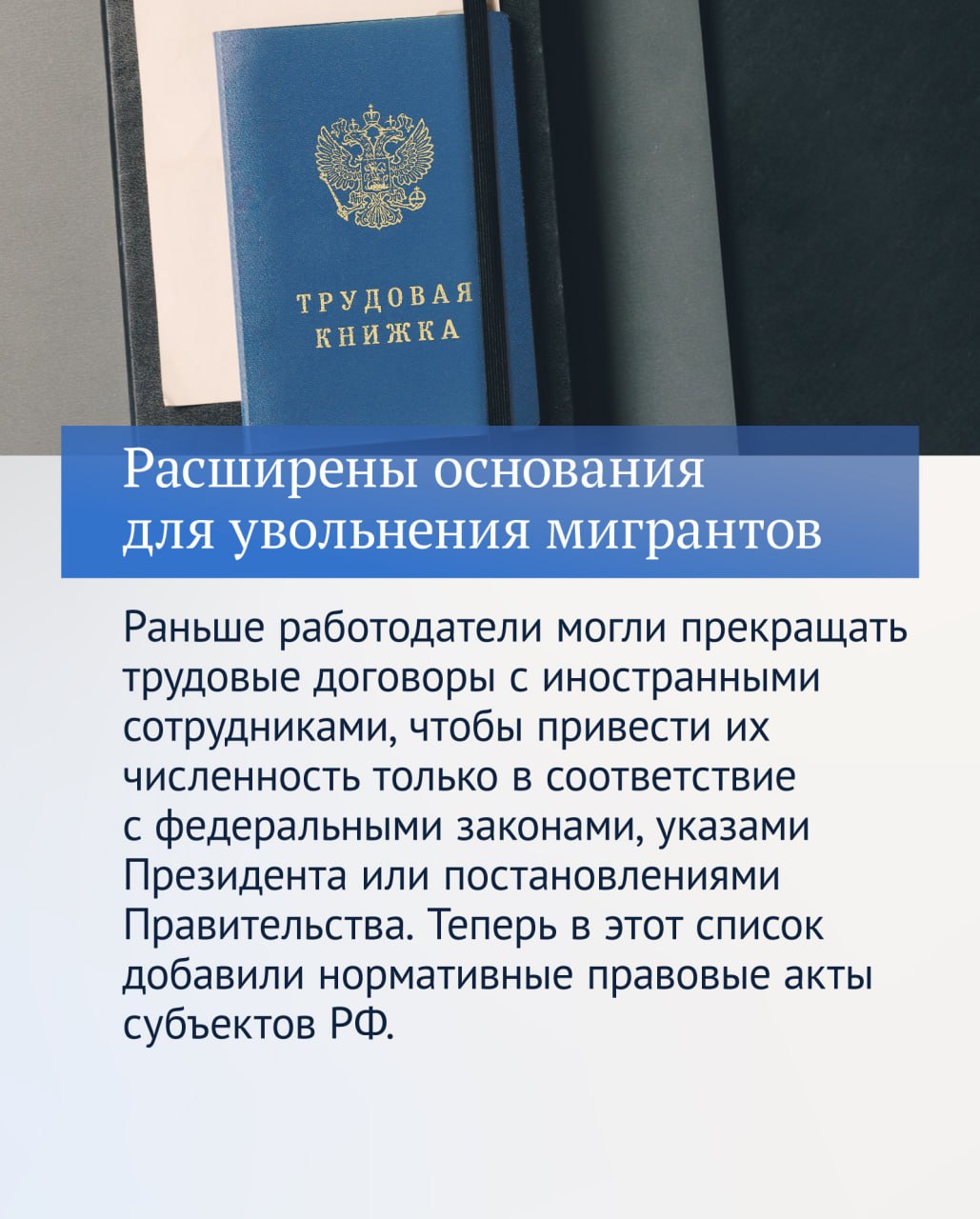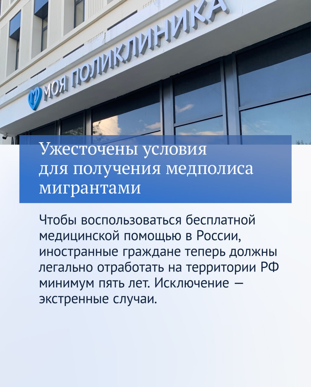 Для мигрантов повысили существующие пошлины и ввели новые. Ужесточены условия для получения ими медицинского полиса. Как подчеркивал Председатель ГД, «те, кто приезжает в нашу страну на работу и хочет пользоваться социальными гарантиями высокого стандарта, должны честным и законным трудом подтвердить свое право на это».