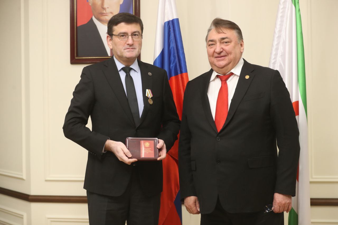 Председатель Правительства Ингушетии Владимир Сластенин вручил медаль «За содействие и помощь участникам СВО» руководителю Управления Федерального казначейства по РИ Ильясу Угурчиеву.