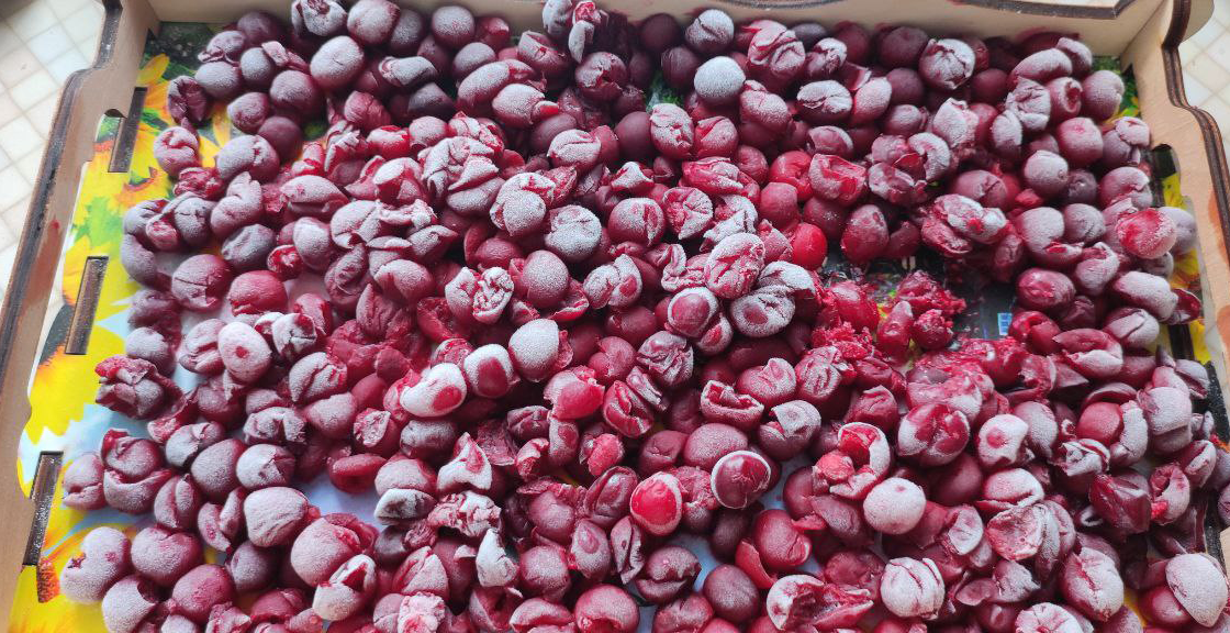 Сначала выбирают самые спелые ягоды и аккуратно промывают холодной водой. После этого плоды избавляют от косточек — контролируемым способом, чтобы сохранить текстуру и форму. Затем вишню раскладывают тонким слоем на поднос, чтобы она замерзла порционно и не слиплась. Поднос отправляют в морозильник, а после заморозки ягоды перекладывают по пакетам, при этом фиксируют вес каждой порции.