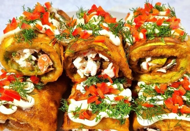 Простой и эффектный рецепт рулетов из кабачков с крабовыми палочками станет отличной находкой для лёгкого ужина или праздничной закуски. Блюдо сочетает сочные обжаренные пластины кабачка с пикантной кремовой начинкой — быстро, ароматно и красиво подаётся на стол.