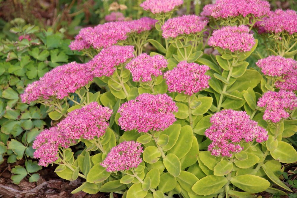 - Очиток 'Herbstfreude': Стебли достигают 60 см, цветение начинается в августе с нежно-розовых цветов, которые к концу сезона становятся оранжево-коричневыми.