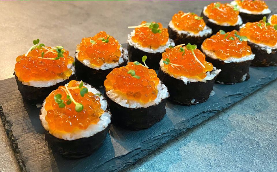 - Острым ножом нарезаем получившиеся роллы на порционные кусочки и сверху выкладываем красную икру, украшая микрозеленью.
