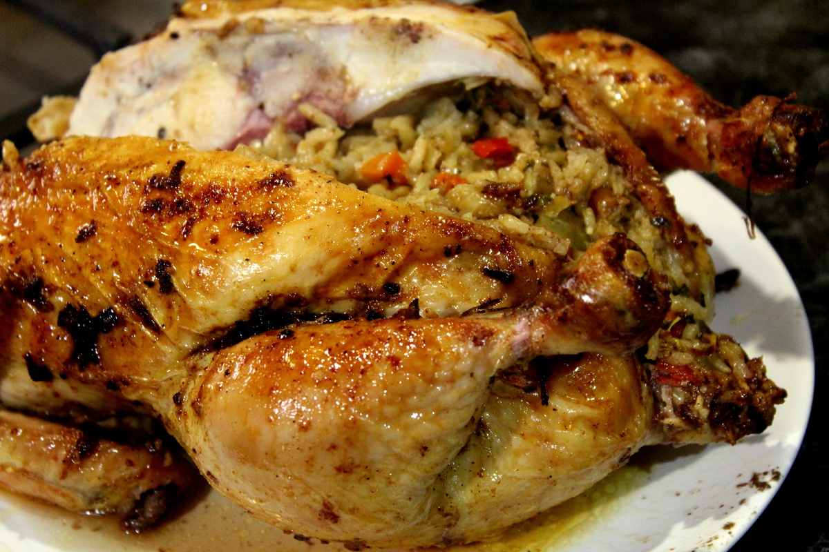 Разогрейте духовую печь до 220°C, смажьте форму для приготовления сливочным маслом. Начините курицу рисом, плотно зафиксируйте ножки, чтобы начинка не выпадала. Уменьшите температуру до 190°C и запекайте около 1 часа 30 минут, поливая курицу соком каждые 30 минут. После готовности дайте ей постоять под фольгой около 15 минут перед подачей, а также можно добавить овощной салат и соус на ваш выбор. Приятного аппетита!