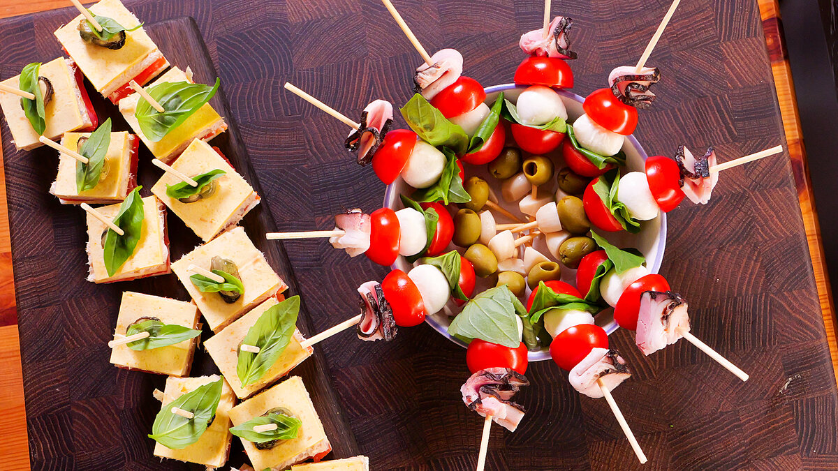 - Соберите закуску, чередуя ингредиенты и украшая листиком базилика и оливкой.