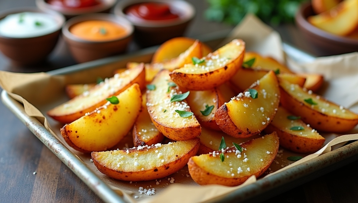Шаг 3: Запекание. Духовку необходимо разогреть до 200–210°C. Выложить картошку на противень в один слой (рекомендуется использовать пергамент или фольгу). Запекать в течение 35–40 минут. Через 25 минут целесообразно перевернуть дольки для равномерного приготовления. Если хочется сырной корочки, за 10 минут до окончания посыпать тертым сыром.