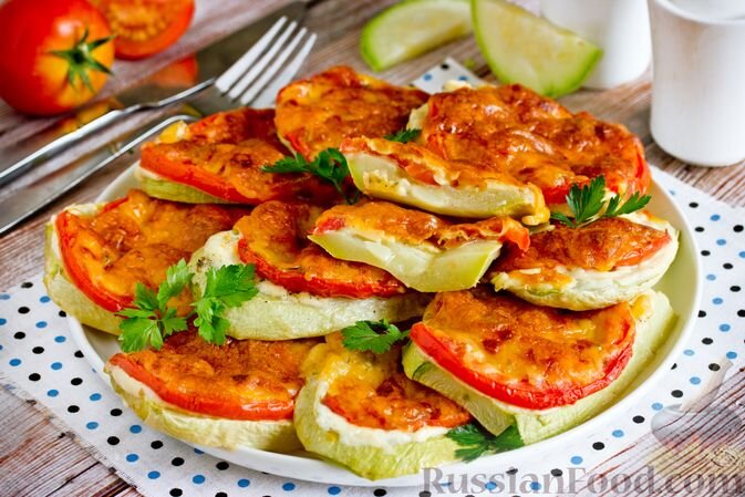- Кабачки с помидорами и сыром: Простая двукомпонентная запеканка, которая сочетает в себе свежесть кабачков и насыщенность томатов с сырной корочкой.
