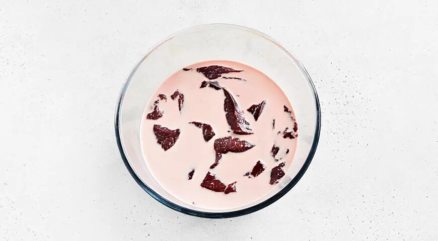 Первым делом стоит заняться говяжьей печенью. Ее необходимо очистить от пленок и нарезать небольшими кусками. После этого кусочки печени заливают молоком и оставляют на 1-2 часа. Этот шаг поможет избавиться от горечи и придаст печени более мягкий вкус. Чем дольше печенка будет в молоке, тем нежнее получится итоговое блюдо. Затем молоко следует слить, а печень — промыть.