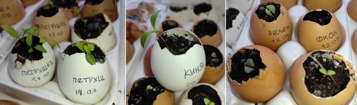 На 15 марта стали видны семядольки, а рассадные ёмкости обильно политы и помещены в теплое место. При появлении первых ростков в яичной упаковке растения были вынесены на свет, и теперь зелёный подоконник ожидает своего времени. Удивление вызывало быструю всхожесть петрушки — она заметно превосходит свои «грядочные» собратья. В одно и то же время появились первые корешки кинзы, что добавляет уверенности в успехе сезона.