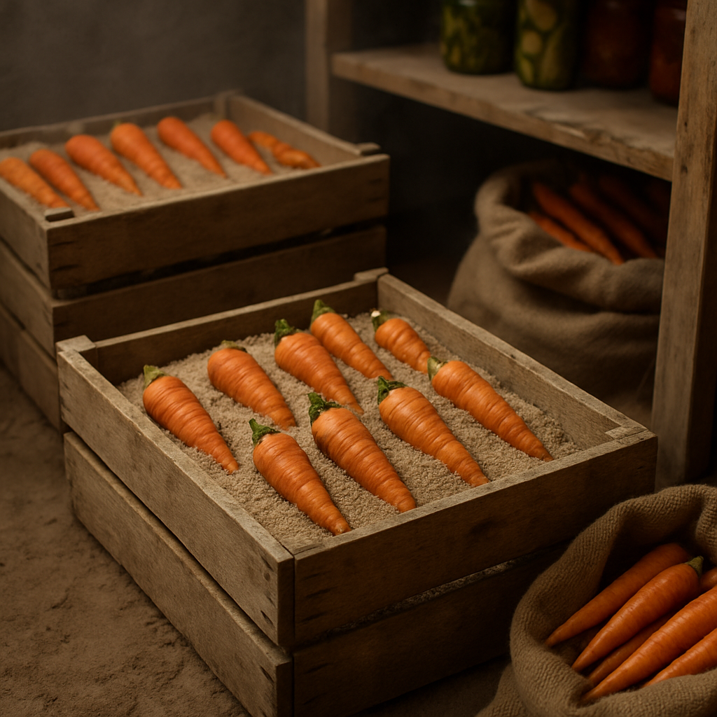 - Слой с песком: Используйте ящики с щелями и прокалённый речной песок. Слои моркови должны быть разделены песком для защиты от гнили. На верхний слой добавьте свёклу для абсорбции лишней влаги.