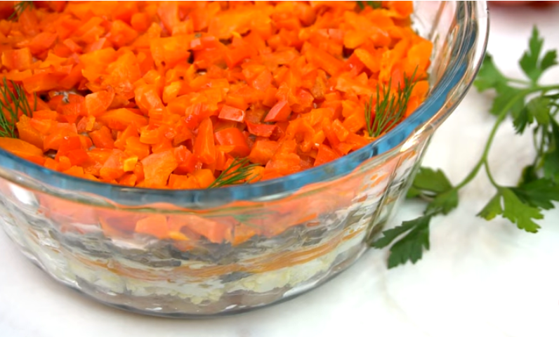 Теперь можно переходить к сборке салата: первым слоем расположить сельдь, слегка сбрызнув растительным маслом, далее яйца, лук, морковь с майонезом, грибы с майонезом и сверху болгарский перец.