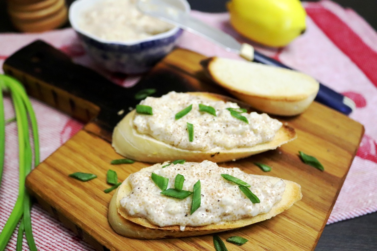 Подайте получившуюся массу на подсушенных ломтиках багета или хлеба. Эта простая и вкусная закуска украсит любой стол и станет настоящим хитом ваших встреч!