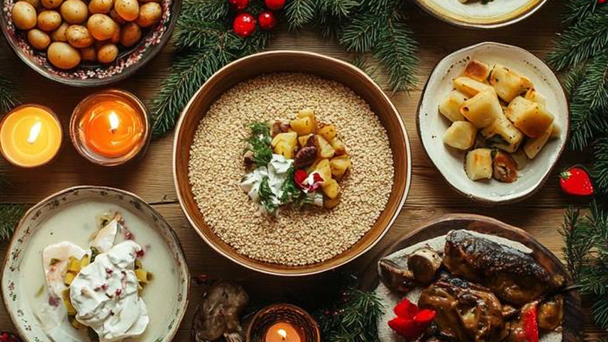 Лев Николаевич Толстой после своего духовного поиска выбрал вегетарианство и его новогодний стол отражал это решение. Простой, но сытный: грибной суп, щи, пшенная каша, запеченный картофель и любимый овсяный кисель. Тем не менее, его супруга Софья Андреевна не разделяла этого подхода и устраивала настоящие угощения для детей и гостей. На столе можно было увидеть жареного гуся с яблоками и множество пирогов, что создавалось радостную атмосферу для всей семьи.