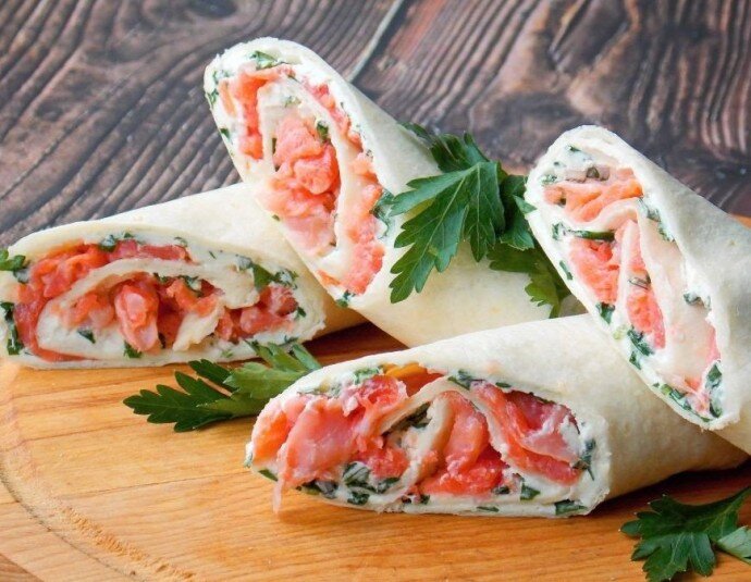 Свежая закуска: рулетики из тортильи с красной рыбой