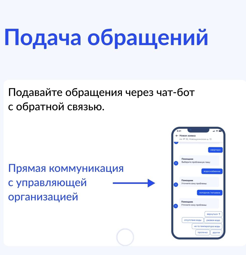 Подавать заявки в управляющую организацию и оперативно получать ответ.