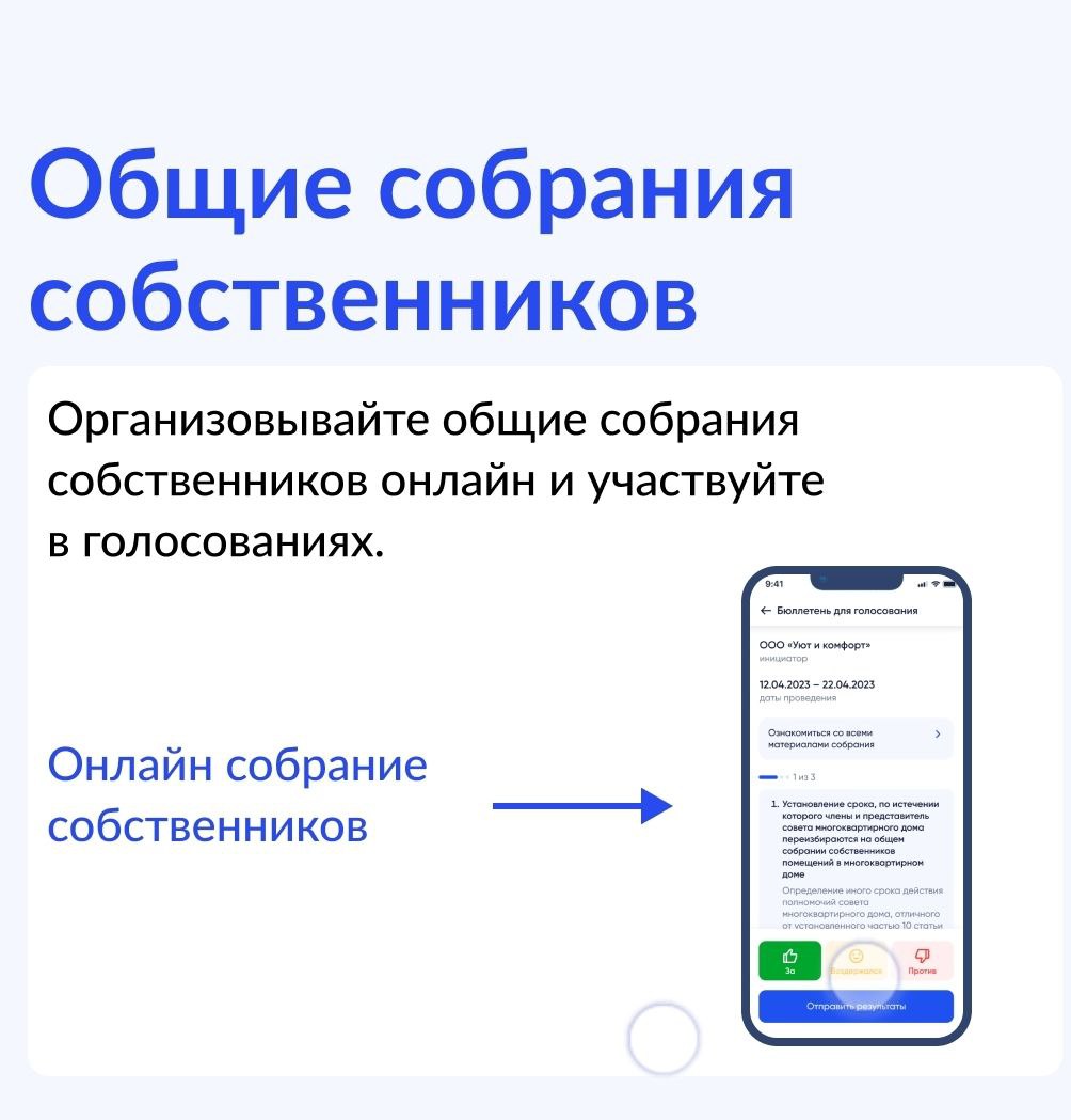 Участвовать в общедомовых собраниях онлайн.