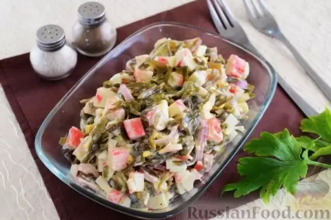 - Салат с крабовыми палочками и морской капустой: Простой, но аппетитный вариант, идеально подходящий как для легкого перекуса, так и для ужина. Яркие цвета и незабываемый вкус подарят вам настоящую гастрономическую радость. Отменный вариант – заправка не калорийным йогуртом или нежирной сметаной, что сделает салат более легким.