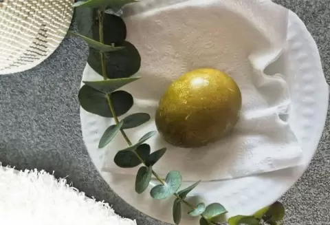 - Чай каркаде (80 г на 2 л воды), уксус (2 ст. л.), луковая шелуха, белая бумага, марля, нитки и зеленый краситель (для малахитового дизайна).