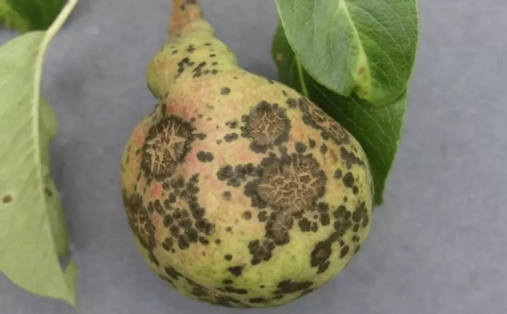 Первые признаки парши проявляются в виде оливковых пятен на листьях, которые со временем чернеют, а также трещин и пробковых наростов на плодах. Раннее опадение листвы также должно насторожить садоводов.