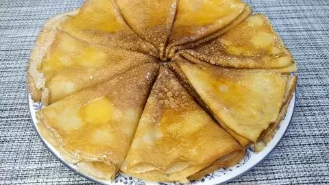 Разогреть сковороду на сильном огне и жарить блинчики по 20-30 секунд с каждой стороны. Перед жаркой тесто стоит перемешать, так как мука может оседать на дно. Когда блинчик перестанет быть влажным сверху, а края начнут подрумяниваться, самое время перевернуть его. После жарки складывать готовые блинчики вчетверо на тарелке и поливать растопленным сливочным маслом. Для дополнительного наслаждения можно посыпать сахарной пудрой или подавать с мёдом, вареньем и сметаной.