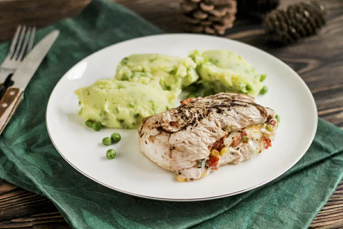 Соберите блюдо, подавая нежное пюре с зелеными горошками рядом с фаршированной индейкой. Полакомьтесь и наслаждайтесь!