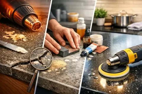 Несмотря на видимые повреждения, нет необходимости в ремонте всей кухни. Правильно подобранные материалы и немного ухаживающих усилий — и ваша кухонная поверхность вновь станет как новенькая.