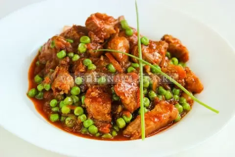 В конце добавьте горошек, не размораживая его предварительно, и дайте ему покипеть всего пару минут. Если используется консервированный горошек, достаточно просто прогреть его. Блюдо подается горячим, идеально в сочетании с картофелем, будь то отварной или картофельное пюре. Приятного аппетита!