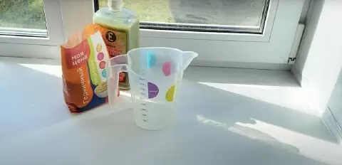 К полученному раствору стоит добавить одну-две столовые ложки жидкого хозяйственного мыла, после чего всё перемешать и добавить пол-литра холодной воды. Теперь чистящее средство готово к использованию. Рекомендуется перелить его в ёмкость с распылителем для удобства нанесения.
